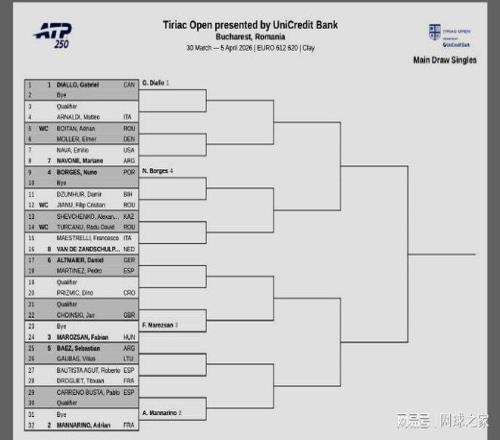 ATP250羅馬尼亞布加勒斯特站的單打簽表也新鮮出爐。迪亞洛、馬納裏諾、馬洛桑、博傑斯位列前四號種子,布斯塔、阿古特、巴埃斯等名將也將參賽。