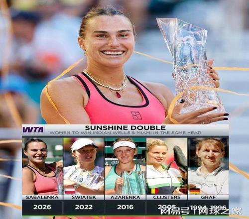 在背靠背登頂之後,薩巴倫卡也加入了同一年包攬印第安維爾斯和邁阿密站冠軍的“陽光雙冠”俱樂部,成為這個俱樂部的第五位成員。前四位是格拉芙(1994、1996)、克裏斯特爾斯(2005)、阿紮倫卡(2016)和斯瓦泰克(2022)。恭喜虎妞!