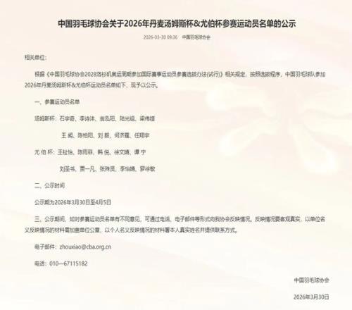 3月30日早上,中國羽毛球協會官網發布公告,對中國羽毛球隊參加2026年丹麥湯姆斯杯&尤伯杯運動員名單進行公示。