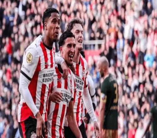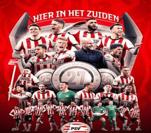 這下,埃因霍溫在還剩5輪的情況下領先第二名17分,數學上已無任何翻盤可能。於是,他們提前加冕,實現荷甲三連冠,隊史第27次捧起聯賽金杯!