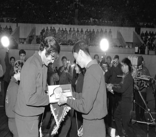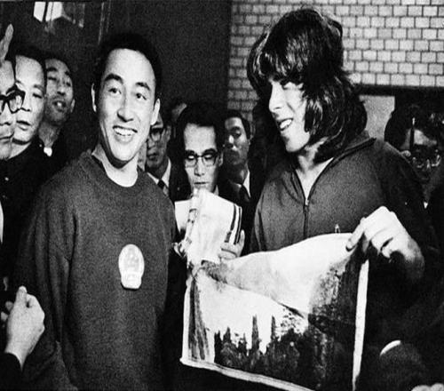 1971年4月,日本名古屋,中國乒乓球隊的運動員莊則棟(左)將一塊杭州織錦工藝品贈送給美國乒乓球隊的運動員格倫·科恩(右)。
