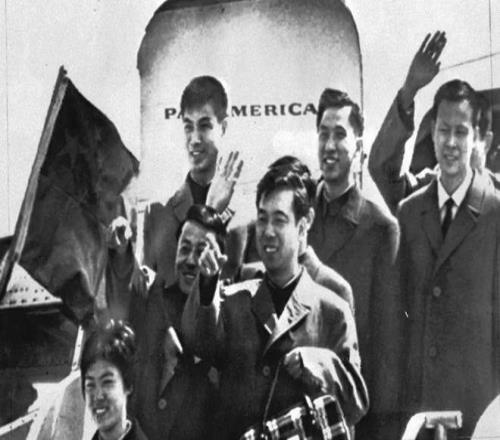 1972年4月13日,中國乒乓球代表團飛抵底特律,對美國進行回訪。新華社 圖