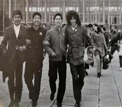 1971年4月15日,美國乒乓球代表團成員格倫·科恩(右一)、埃羅爾·雷塞克(左一)與上海乒乓球隊運動員姚振緒(右二)、吳新民(左二)合影。新華社 圖